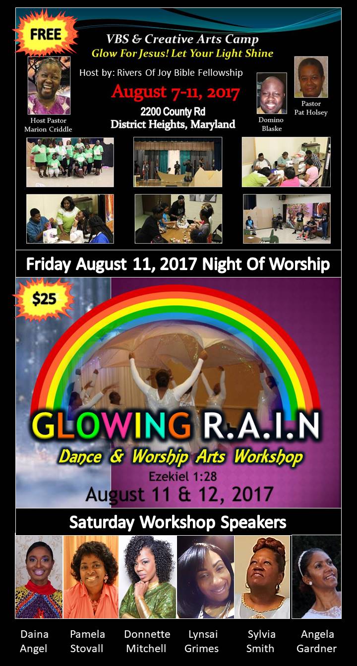 On that Saturday from 8:00am -2:00pm we will host “GLOWING RAIN” Dance & Worship Arts Workshop where we will have instructors teaching on Fitness, Flags, Garments, Pageantry and more.